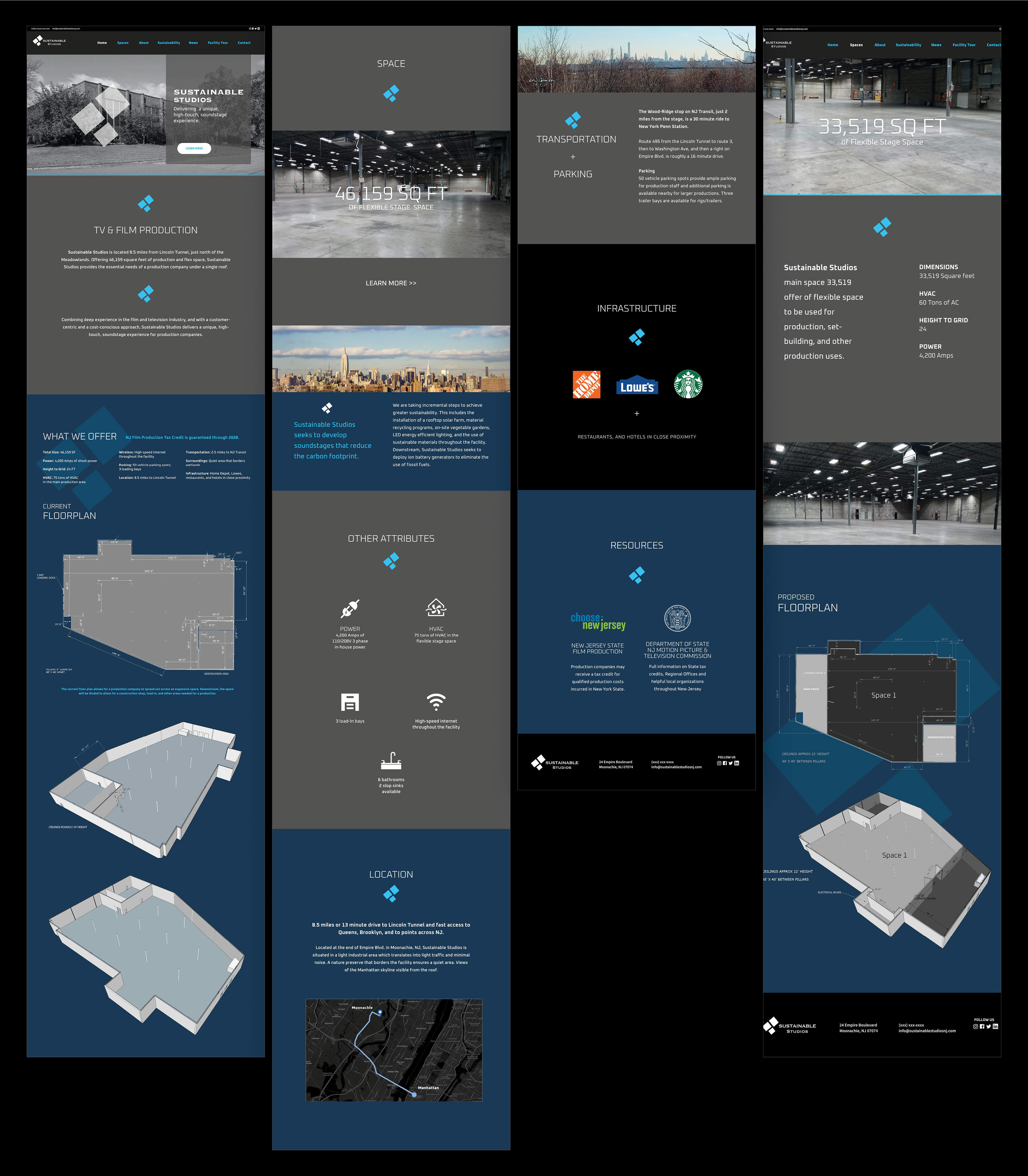 Design an intuitive, information-rich website for Sustainable Studios, a New Jersey-based film and TV production facility. The objective was to create a digital tool for location scouts and producers that clearly showcases the studio’s technical specifications, expansive floor plans, and logistical amenities to drive booking inquiries.